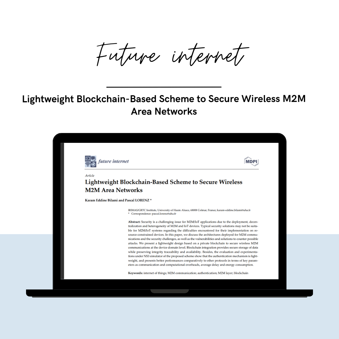 La sécurité représente un défi majeur pour les applications M2M/IoT en raison du déploiement, de la décentralisation et de l’hétérogénéité des dispositifs M2M et IoT. Les solutions de sécurité typiques peuvent ne pas être adaptées aux systèmes M2M/IoT en raison des difficultés rencontrées pour leur mise en œuvre sur des dispositifs aux ressources limitées. Dans ce contexte, nous proposons un mécanisme d’authentification et d’autorisation léger basé sur une blockchain privée afin de sécuriser les communications sans fil M2M au niveau du domaine réseau des dispositifs. L’intégration de la blockchain offre un stockage sécurisé des données tout en préservant l’intégrité, la traçabilité et la disponibilité des informations échangées. Nous présentons par la suite une enquête sur différents protocoles de sécurité pour les communications M2M sans fil, suivie d’une description détaillée de l’architecture de communication M2M standard et de ses différents composants. Ensuite, nous exposons en détail le schéma d’authentification proposé pour le domaine des dispositifs M2M, en mettant en lumière ses phases de pré-enregistrement, d’enregistrement et d’authentification. Nous analysons également les performances de ce schéma à l’aide de simulations expérimentales et nous comparons ses résultats avec d’autres protocoles similaires. Enfin, nous discutons des avantages introduits par notre approche et des directions de recherche futures envisageables.