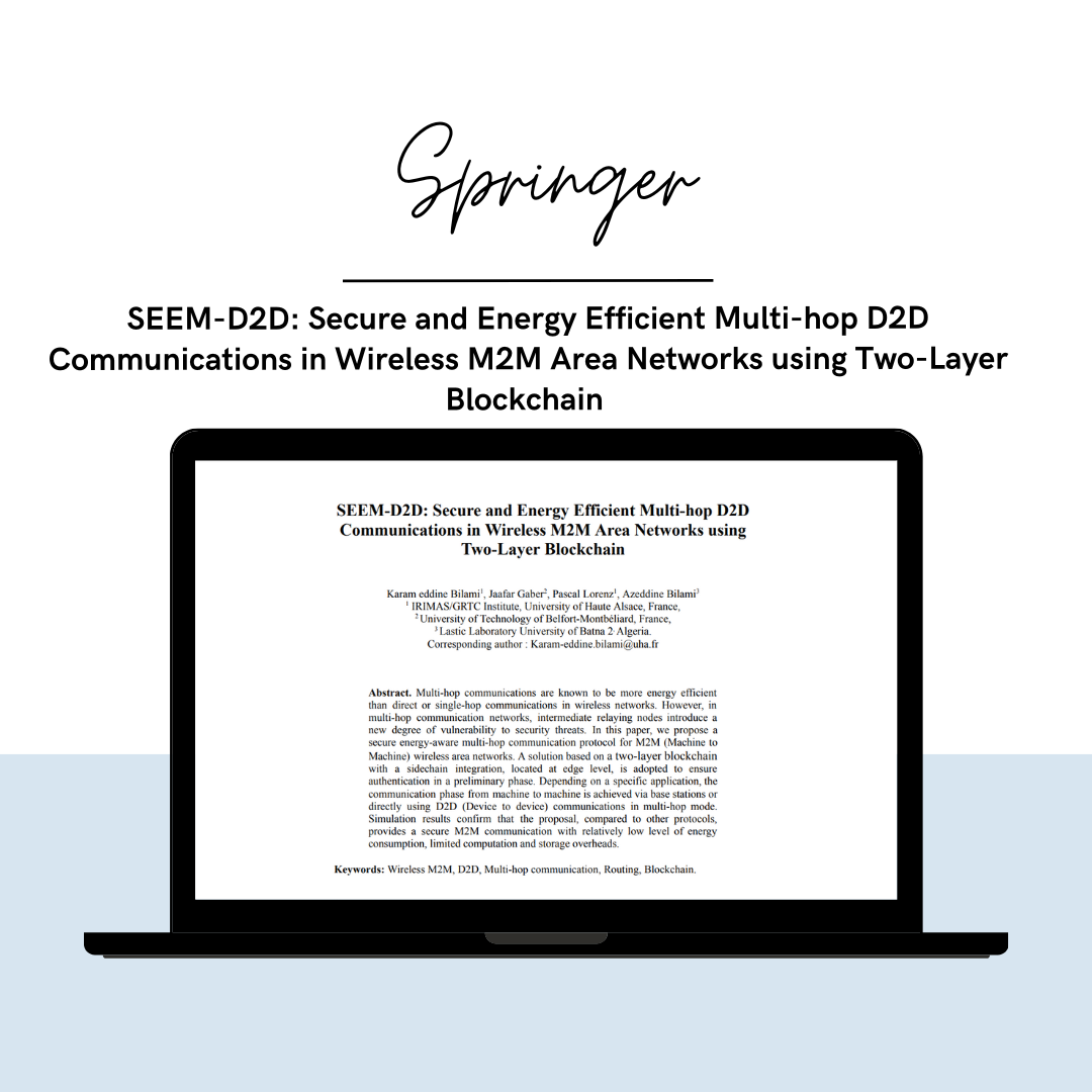 Dans le contexte des réseaux sans fil M2M, les communications multi-sauts sont reconnues pour leur efficacité énergétique supérieure par rapport aux communications directes ou à saut unique. Toutefois, dans les réseaux de communication multi-sauts, les nœuds de relais intermédiaires introduisent un nouveau degré de vulnérabilité aux menaces de sécurité. Pour répondre à ce défi, cet article propose un protocole de communication multi-sauts sécurisé et économe en énergie pour les réseaux sans fil M2M. Ce protocole repose sur l’intégration d’une blockchain à deux couches avec une intégration de sidechain, positionnée au niveau du bord du réseau. Il vise à garantir une authentification sécurisée dès la phase préliminaire, permettant ainsi une communication efficace entre les appareils M2M via des relais intermédiaires en mode multi-sauts. Cette approche offre une sécurité renforcée pour les communications M2M, tout en minimisant la consommation d’énergie et les surcharges computationnelles et de stockage.
